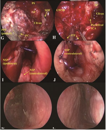图1. 病例1.内镜下经鼻形成双侧鼻中隔皮瓣切除颅底脑膜瘤。(A)腹侧切口;(B)尾侧切口;(C)背侧切口;(D)将对侧鼻中隔皮瓣翻至后鼻孔;(E)作同侧鼻中隔皮瓣;(F)将同侧鼻中隔皮瓣翻至对侧后鼻孔;(G)暴露翼腭窝;(H)显露颞骨窝和蝶骨大翼;(I)缝合同侧鼻中隔皮瓣;(J)术后3个月缝合对侧鼻中隔皮瓣;(K)右鼻腔和(L)左鼻腔。IT:下鼻甲;SO:蝶孔;NSP:鼻中隔皮瓣;PS:蝶骨平面;SR:鞍底;SOF:眶上裂;PPF:翼腭筋膜;PC:翼管;ITF:颞下窝。