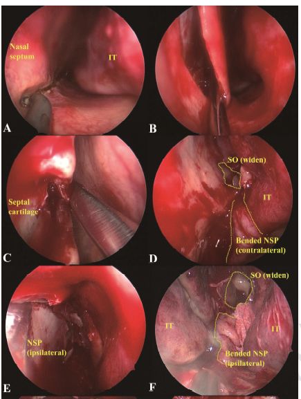 作者回顾2014年至2017年间内镜下经鼻形成双侧鼻中隔瓣进行颅底肿瘤切除的9例患者;其中,4例男性,5例女性;平均年龄为39.9±14.8岁。2例患者为骨化性纤维瘤、2例眼眶血管瘤、2例三叉神经鞘瘤,1例血管纤维瘤,1例脑膜瘤和1例粘液纤维肉瘤。7例肿瘤全切除,术后平均随访15.2±9.4个月,鼻腔并发症少见。结合图1、2、3和4,介绍手术方法。