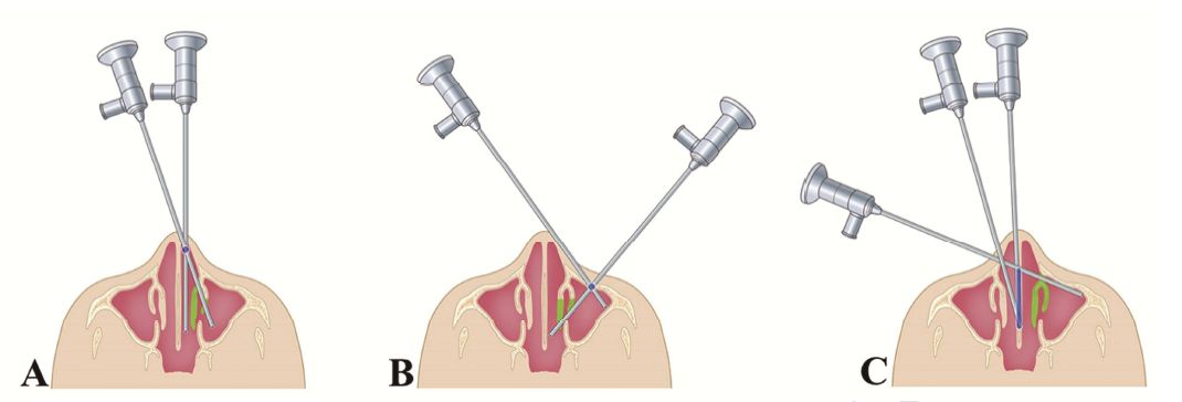 图4. 三种不同的操作法:(A)直接经鼻入路;(B)同侧唇下入路;(C)横穿鼻中隔入路。直接经鼻和同侧唇下入路限制手术范围,因为只有一个鼻孔通道。内镜下横穿鼻中隔提高手术的可视化和可操作性,允许自由进入对侧鼻孔(蓝色表示内镜轴,绿色表示可移动结构)。