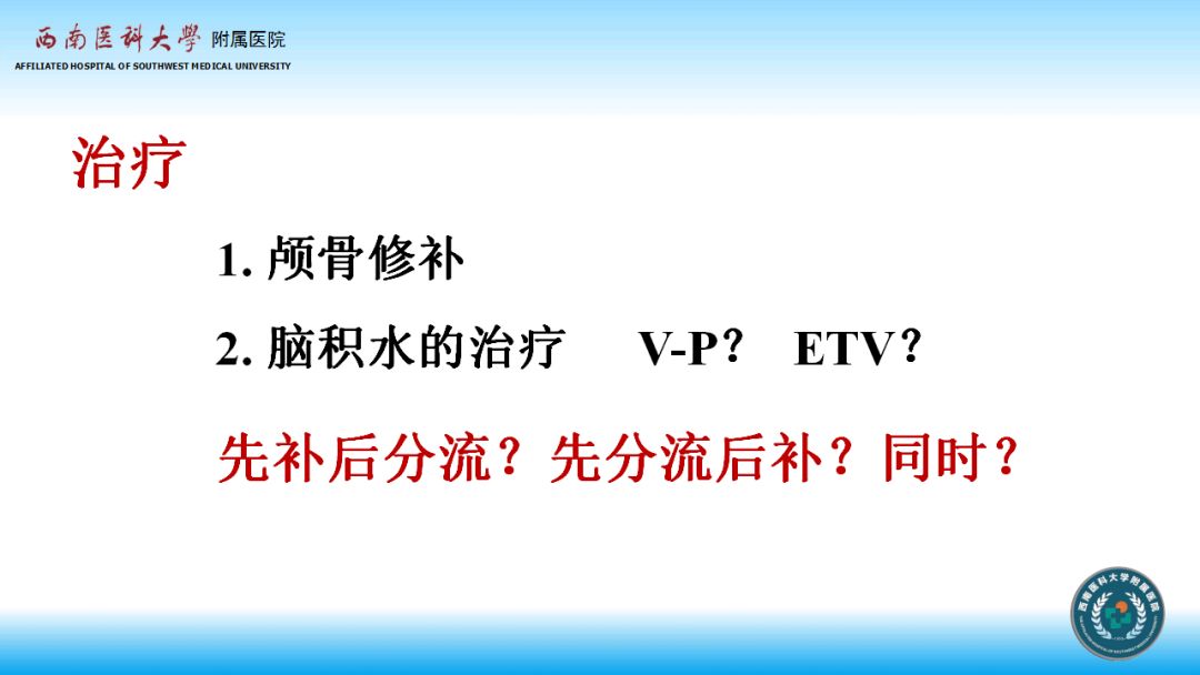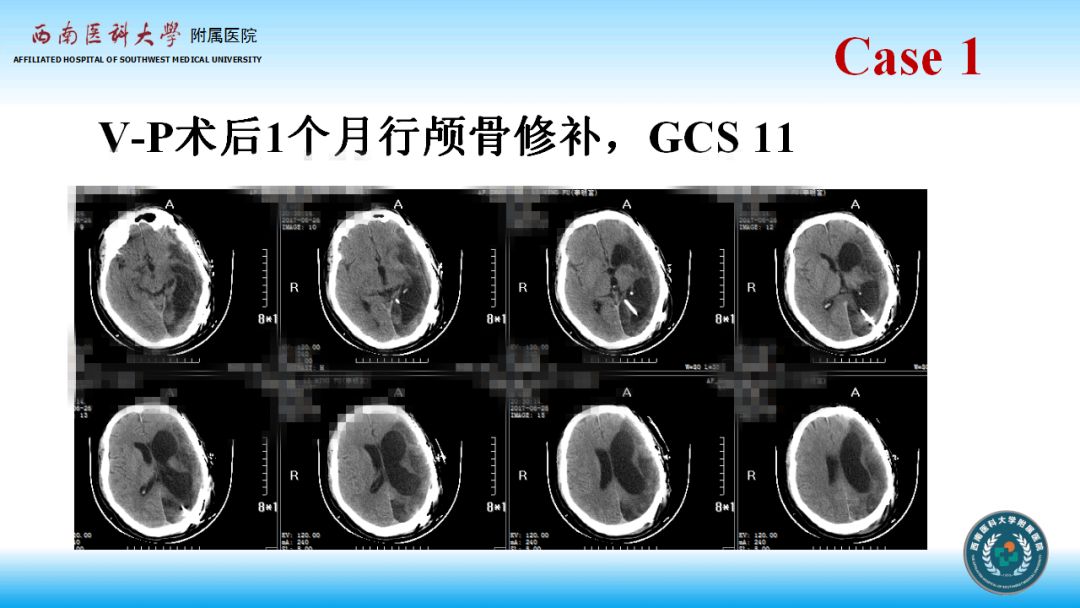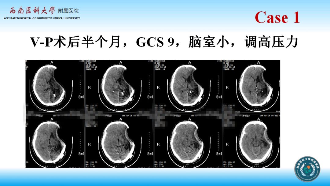 4、分流手术时机在适应症和条件允许的情况下应尽早进行,合并去骨瓣减压病例应综合考虑减压后时间、积水严重程度、切口愈合情况、是否有过切口感染等因素来决定同期手术,还是先分流或先修补,同样在条件允许的情况下应该同期手术,比如上述病例,可倾向同期手术,当然同期手术更要关注感染等并发症的预防;如果仅行分流手术,可调压管的压力初压适当调高,然后再往下调,可以减少过度分流和脑组织塌陷的发生率。