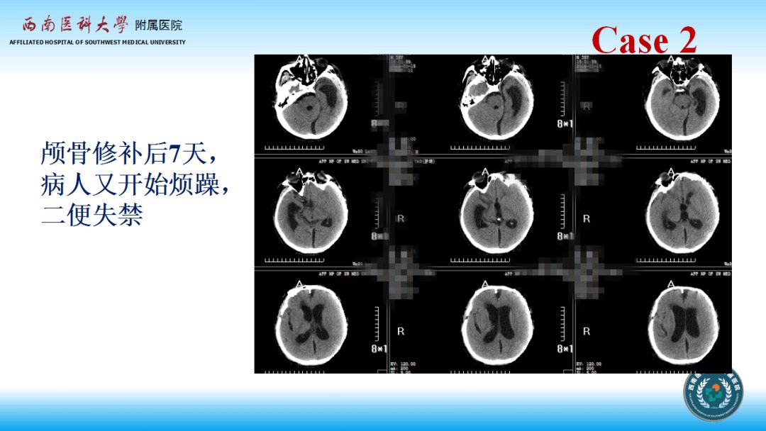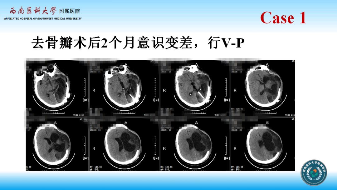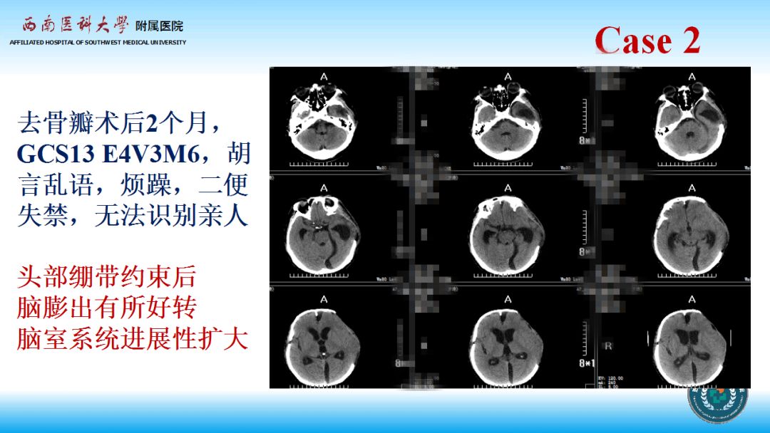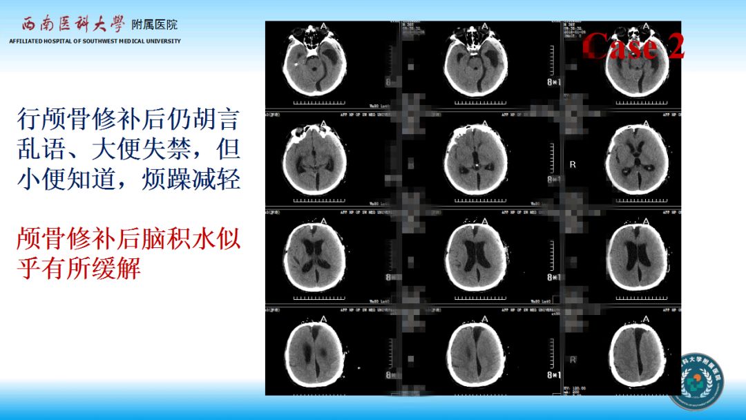 第二例病人,先进行颅骨修补术,术后脑积水表现较为典型,符合颅骨修补导致脑脊液流出阻力增加可在部分病人中引起继发脑积水的理论。
