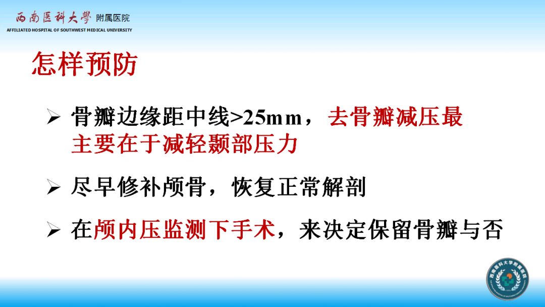 1、去大骨瓣减压术在降低颅内压、挽救患者生命的同时,也改变了人体正常的解剖结构(增大了颅腔的容积),从而改变了脑脊液的循环。因此,在患者病情趋于稳定的情况下,宜及早(术后1-3个月内)实施颅骨修补术,以恢复颅腔的正常解剖状态,从而达到正常的生理状态。