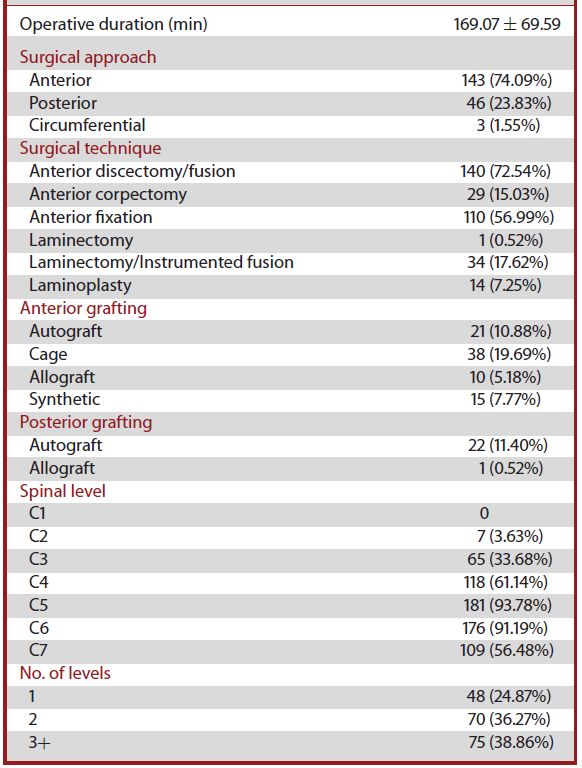 CSM北美(CSM-NA)或CSM国际(CSM-I)试验是前瞻性、多中心临床试验,目的是评估减压手术对DCM患者的功能状态、失能程度和生活质量(QOL)的影响。研究对象纳入标准如下,年龄≥18岁;症状性DCM,至少有1个脊髓受压的临床症状;有颈髓压迫的影像学证据;既往无颈椎手术史。排除无症状DCM、感染、肿瘤性疾病、类风湿关节炎、创伤、强直性脊柱炎或伴腰椎管狭窄的患者。共有193例轻度DCM患者,纳入CSM-NA或CSM-I试验。患者的改良日本骨科协会量表(mJOA)评分为15-17分。所有患者均进行手术治疗,具体情况见表1。