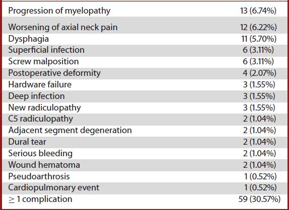 术后并发症,13例(6.7%)脊髓症状恶化,12例(6.2%)节段性颈痛加重和11例(5.7%)吞咽困难。6例(3.1%)切口浅部感染,6例(3.1%)螺钉错位和4例(2.1%)脊柱后凸畸形。59例(30.6%)患者至少有1例发生并发症(表3)。
