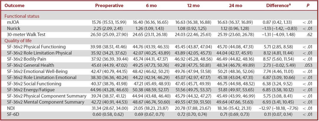 采用标准化平均差法(SMD),比较患者术前与正常人群的生活质量得分;以及评估患者术前与术后6个月、1年和2年时的功能状态(mJOA、Nurick grade)、失能情况(Neck Disability Index,NDI)和生活质量(Short Form-36 version 2,SF-36v2);并监测患者术后并发症。