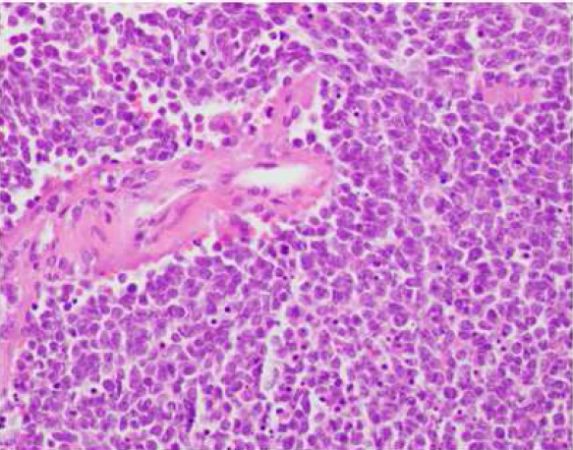 图5. 组织病理切片提示,肿瘤内均匀分布的圆形细胞,核仁明显,细胞质透明空泡化。