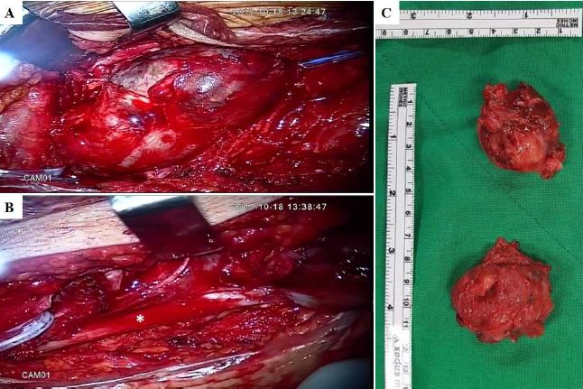 图4. 术中照片。A.肿瘤有两个小叶,轻度浸润坐骨神经;B.肿瘤切除后未损伤坐骨神经(星形标记);C.切除的肿瘤标本。