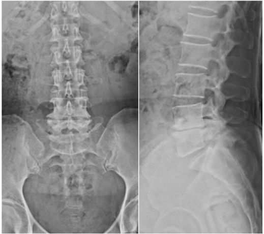 图1. X线平片显示L5-S1椎体峡部裂和I级腰椎滑脱,L4-L5椎间盘间隙减小。