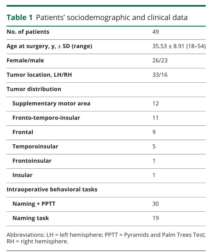 作者收集2007年至2016年间584例脑肿瘤患者的术中脑电刺激数据。患者入组标准,右利手;病理学诊断为弥漫性低级别胶质瘤;每个患者前额叶至少有一个执行命名任务的语言性语义认知位点或执行与视觉语义相关任务的非语言性语义认知位点。最终纳入49例低级别胶质瘤患者,其中33例肿瘤位于左侧,16例肿瘤位于右侧。30例测试执行命名任务的语言性语义认知位点,以及执行视觉语义相关任务的非语言性语义认知位点,19例测试执行命名任务的语言性语义认知位点(表1)。
