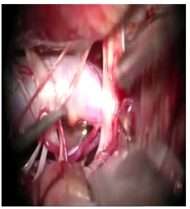 图2. 术中照片。左图:显露面神经根部,可见粗大迂曲的基底动脉从内侧压迫面神经;中图:将muslin细棉条套过基底动脉;右图:用直动脉瘤夹将悬带固定于斜坡硬脑膜。