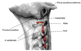 图1. 枕颈交界区矢状面观,显示寰枕间隙穿刺点、乳突、外耳孔、C1-C4横突孔以及椎动脉。