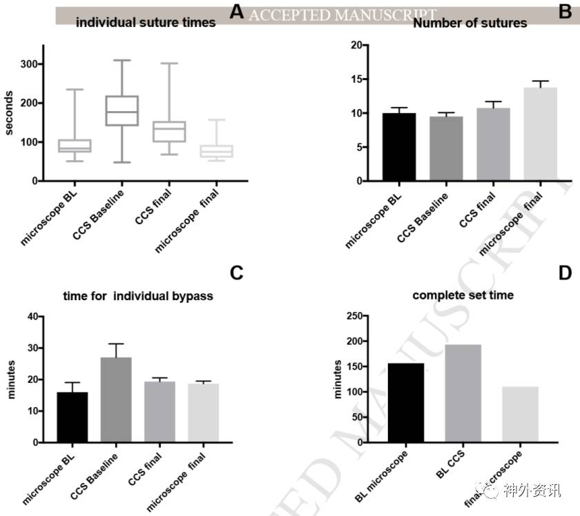 图2. 通过以智能手机为基础的显微操作训练后,在端-端旁路吻合的缝针数目增加(P=0.0010),缝合所需时间减少(P=0.0258)。训练旁路吻合的时间差异无统计学意义(P=0.137)。