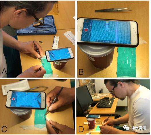图1. A.必备的装置:咖啡杯、智能手机、缝合线以及手术器械;B.改变咖啡杯大小调整聚焦区域;C.记录操作过程;D.通过手机屏幕可以看到自己的操作。