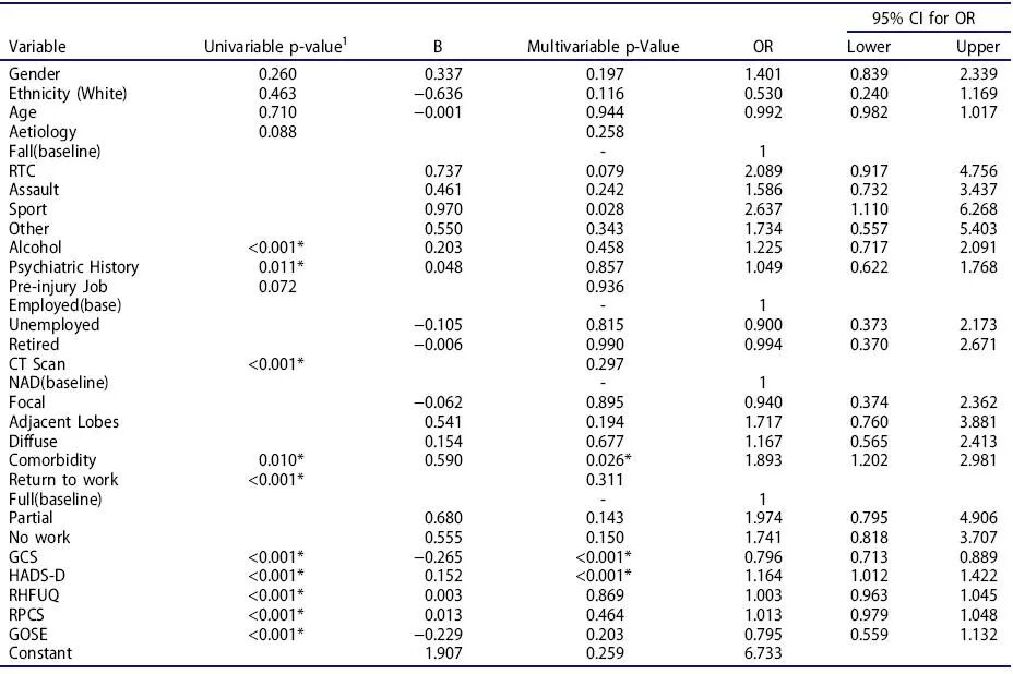 表1. TBI后患者嗅觉丧失的单因素和多因素logistic回归分析。