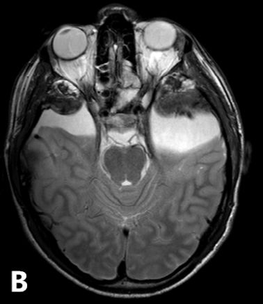 图1. 双侧颞部蛛网膜囊肿前端发生创伤性硬膜外血肿。A.头颅CT;B.MRI-T2加权像。