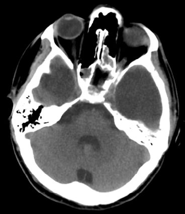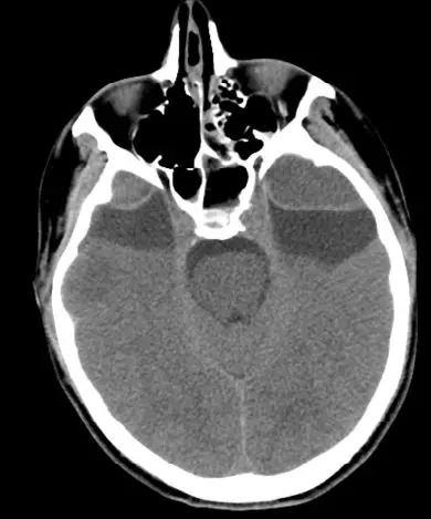25岁男性患者,有双侧颞部蛛网膜囊肿,因醉驾而发生车祸。入院时GCS评分为15分,体格检查未见阳性体征;头颅CT和MRI提示双侧颞部蛛网膜囊肿的前端各有一颞部硬膜外血肿。左颞蛛网膜囊肿为4.8×5.4cm,右颞囊肿为3.1×3.7cm。左侧颞部EDH最大厚度3cm,右侧2.2cm;同时伴有横向的颞骨骨折(图1)。给予患者保守治疗。随后的CT复查显示EDH稳定(图2)。出院后3周,复查头颅CT显示,EDH明显吸收(图3)。