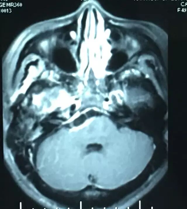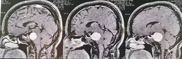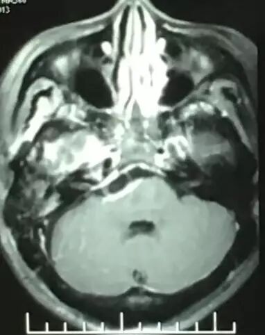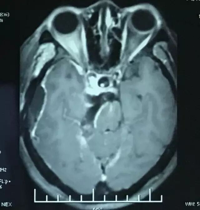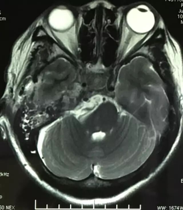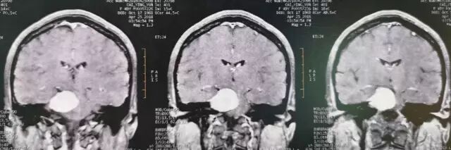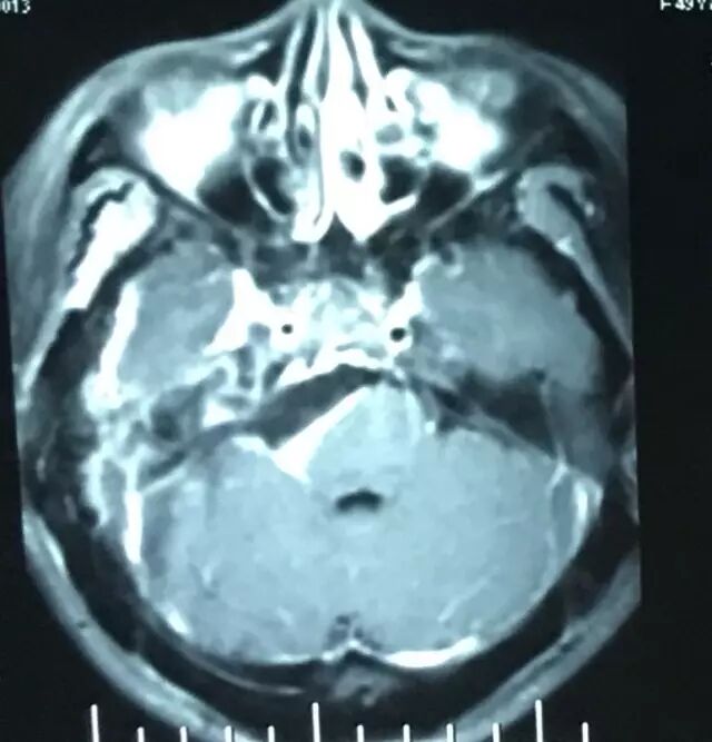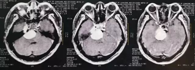 查体:神清语利,双瞳等,光反应灵敏,右侧面部浅感觉减退,行走不稳,四肢肌力基本正常。核磁共振检查见右侧岩斜区肿瘤,考虑岩斜脑膜瘤。