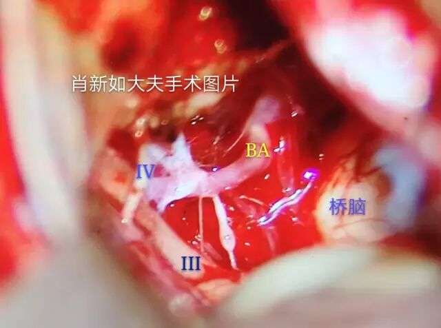 肿瘤切除后动眼神经(III)、滑车神经(IV)、基底动脉(BA)、脑干等重要结构保护良好。