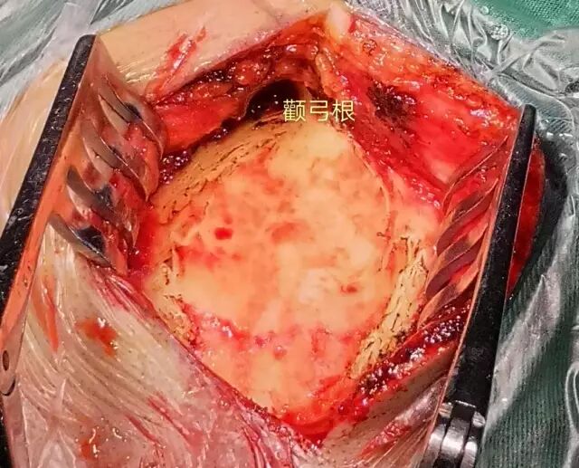切开皮肤,将颞肌撑开,暴露颧弓根部