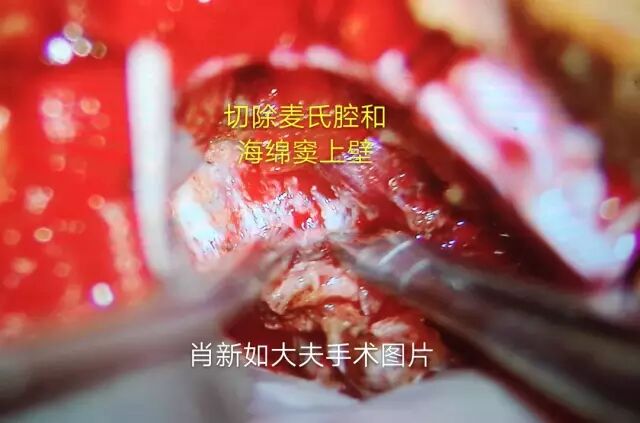 切除MECKEL氏腔、海绵窦上壁(中颅底硬脑膜),切除麦氏腔内肿瘤,斜坡部分暴露更充分。