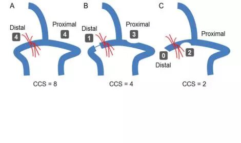 窦静脉区引流静脉开放程度评分原理图。远端(血流下游)指DAVF与同侧颈静脉之间部分,近端(血流上游)指DAVF与对侧颈静脉之间部分。在窦静脉区静脉远端和近端的狭窄程度分为0~4分:0分是完全或局部闭塞;1分是静脉段发育不良或重度狭窄,开放度<25%;2分是中度狭窄,开放度25%–50%;3分是狭窄段静脉开放度50%–75%;4分是完全开放或几乎全开放,开放度75%–100%。CCS评分为远端和近端的狭窄程度之和,0~8分:A图表示正常,远端和近端的狭窄程度均为4分,CCS评分等于8分;B图示远端和近端的狭窄程度各为1分和3分,CCS评分等于4分;C图示远端和近端的狭窄程度各为0分和2分,CCS评分等于2分。