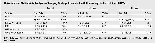 研究结果显示,与非出血组相比,出血组患者合并窦静脉区静脉狭窄患者的比例更大(80%比27%,p<0.001),而且更易出现脑白质水肿、静脉窦内双轨征和假静脉炎征像(表1)。