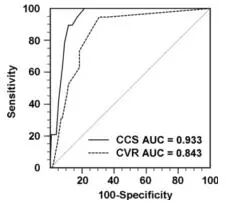 受试者操作特性曲线分析提示,与CVR模型评分相比,CCS模型预测颅内出血的灵敏度和特异度更高(AUC表明,CCS与CVR的灵敏度为0.933比0.843,95% CI,0.015-0.165;P=0.018)(图2)。