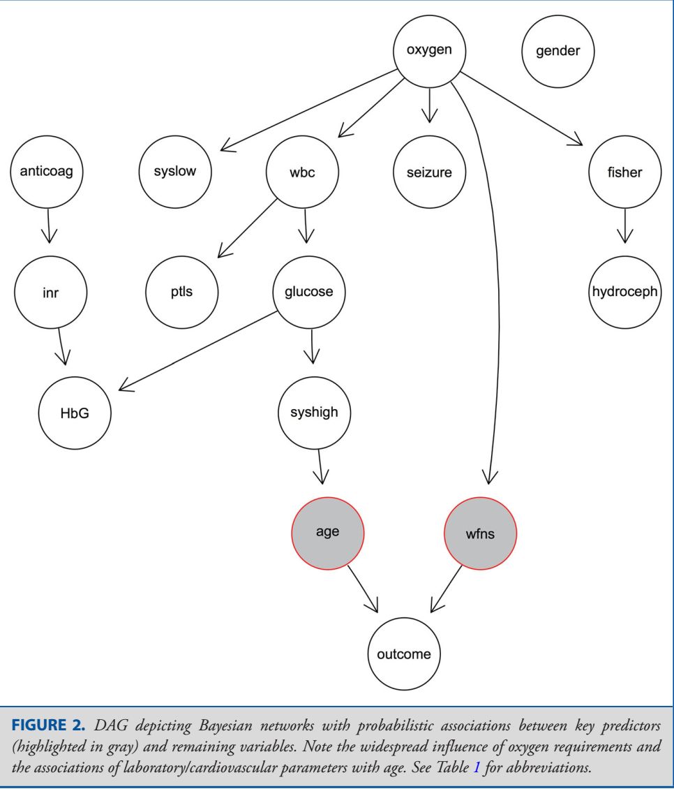 本文是在post-ISAT首次报道aSAH手术患者早期预后与预测因子之间关系的研究。研究者回顾了由单个术者急诊夹闭的226例aSAH患者的临床资料。结果表明WFNS分级和年龄是最重要的影响预测因素。贝叶斯网络分析提示二者与多因素如实验室检查结果以及心肺参数指标等之间存在相关性。在相关预测因子较少时,多变量模型分析具有较好的预测能力。贝叶斯网络分析是一种强大的工具,可以将两个关键预测因子与入院的参数之间的广泛联系可视化,并解释它们的重要性。