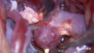3. 拆除旧瘤夹:旧的瘤夹干扰术野和妨碍新瘤夹置入,应该去除。旧瘤夹通常被周围结缔组织紧密包裹,可以使用小的手术刀和显微剪轻柔的切开包裹的结缔组织,暴露瘤夹表面(图3)。如果以前手术置入多枚瘤夹,取出所需时间较长,或需进行临时性阻断。