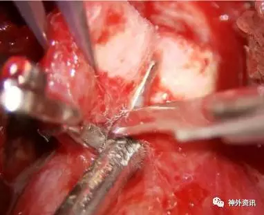 图3. 剪断包裹瘤夹的结缔组织以便去除之。