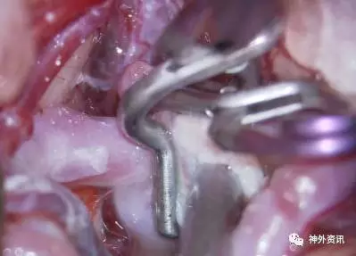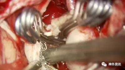 图5. 使用弧形夹和带孔瘤夹夹闭动脉瘤。