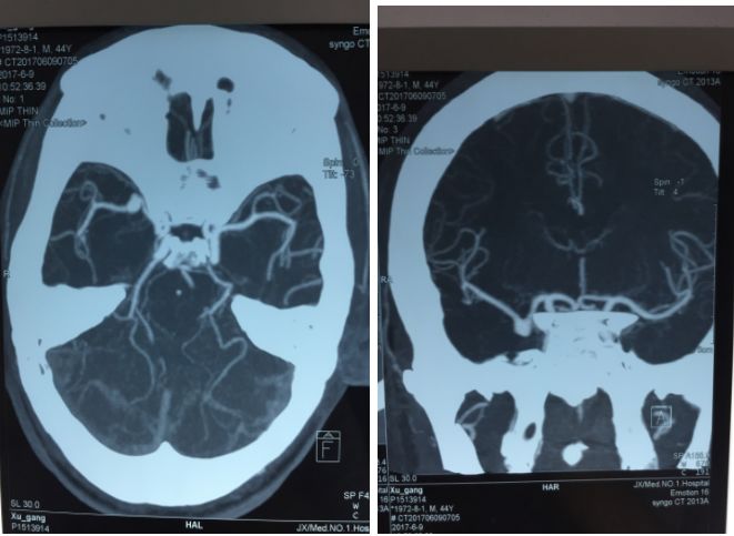 当地医院头颅CT未见蛛网膜下腔出血,为求进一步治疗转入我院,行CTA提示右侧大脑中动脉瘤。