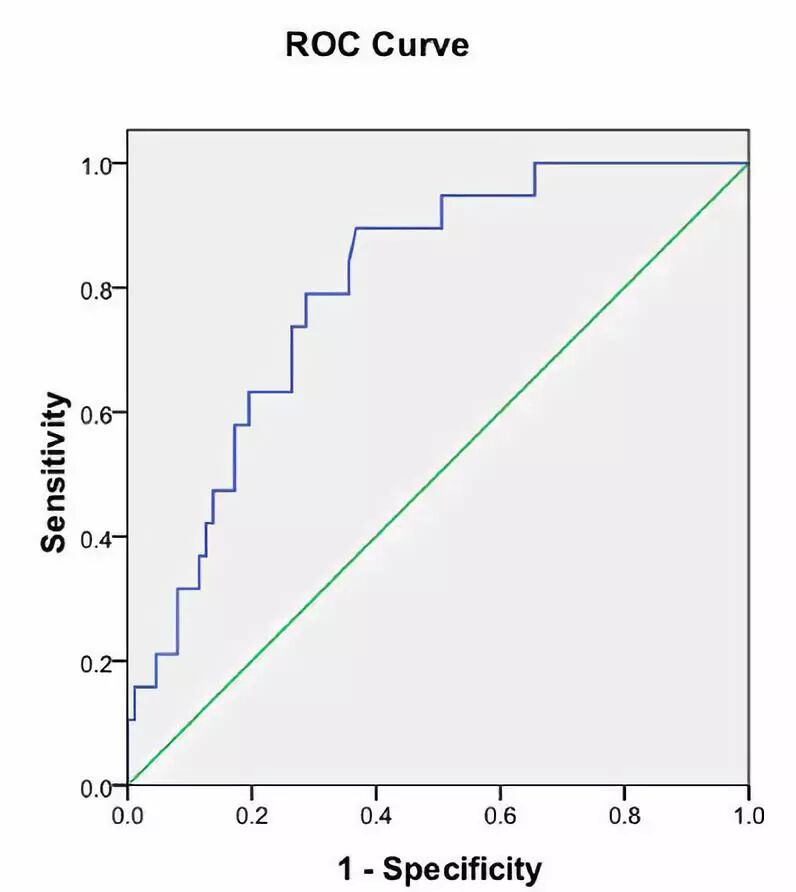 图5.ROC曲线:增强程度的界值是61.5%,ROC曲线下面积0.798,预测动脉瘤破裂的敏感度和特异度分别是89.5%,63.2%。