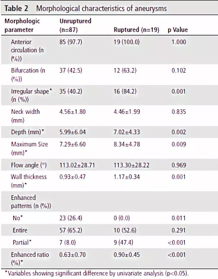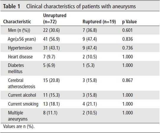 本研究同时研究了患者临床资料,如年龄和脑动脉粥样硬化。作者既往的研究指出这些因素和破裂相关。然而,本研究中在破裂组和未破裂组之间没有统计学差异。原因可能是本研究样本较小。