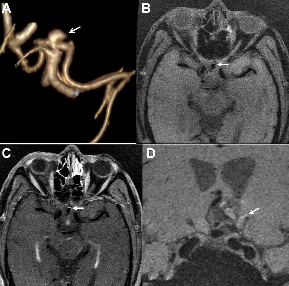 图3.前交通动脉瘤,CTA 3D图像显示形态不规则(A),与增强前(B)相比,增强后可见瘤壁部分增强(C),19天后,动脉瘤破裂出血(D)。