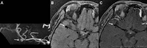 图2.右侧大脑中动脉分叉部的动脉瘤(A),与增强前(B)相比,增强后可见瘤壁完全增强(C)。