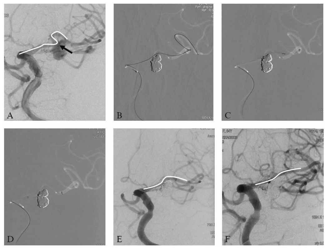 F:术后6个月后DSA复查结果,动脉瘤完全不显影,分支通畅,白色曲线所示大脑中动脉上干,与术前相比(A)血管曲度进一步变直