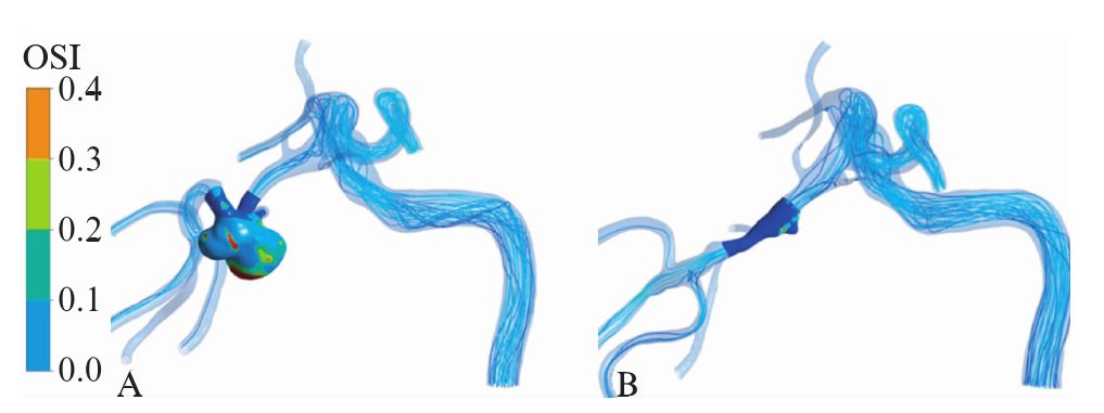 A:术前,B:术后;OSI:剪切震荡指数,是动脉瘤生成和复发的重要参数