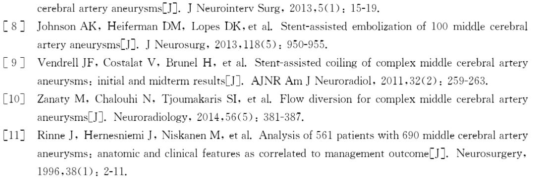 大脑中动脉(MCA)动脉瘤约占颅内动脉瘤的20%,按部位分为M1段动脉瘤、分叉部动脉瘤及MLA远端动脉瘤,其中绝大部分(可达80%)位于大脑中动脉分叉部。以往对MLA分叉部动脉瘤的研究表明其多为小型或微型,且多合并其他颅内动脉瘤。Rinne等对561例大脑中动脉动脉瘤患者的统计显示分叉部动脉瘤36%为微型(2~7 mm),41%为小型(8~14 mm),16%为大型(15~24 mm),巨大型动脉瘤约占6%。Dashti等对1166例大脑中动脉动脉瘤患者的分析中发现44%的患者有多发动脉瘤,17%的患者有多发的大脑中