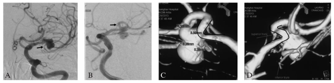 C:三维旋转造影重建显示M2,M3在瘤颈处成明显约60°的锐角,下干自瘤颈处发出