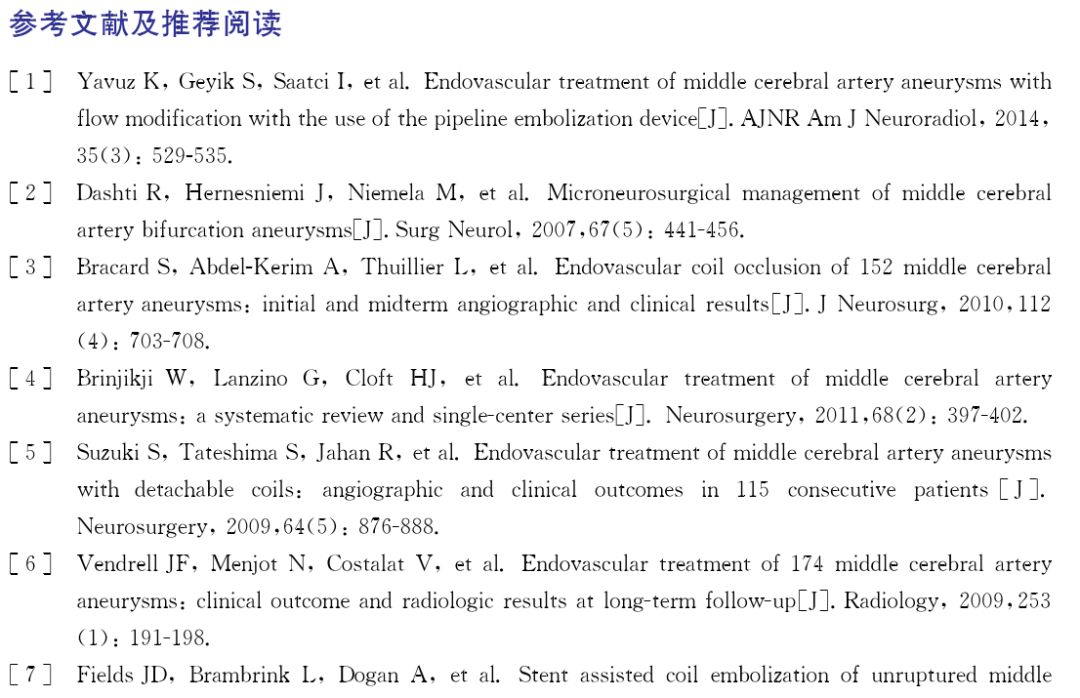 大脑中动脉动脉瘤相比其他位置动脉瘤而言位置浅,容易暴露,且因同时合并颅内血肿需行血肿清除等原因,传统认为开颅动脉瘤夹闭是MCA动脉瘤治疗的经典术式。但随着介入技术的发展,如三维旋转DSA的普及、新型弹簧圈的引入以及支架和球囊等辅助技术的应用使得越来越多复杂的动脉瘤得以通过血管内介入的方式治疗;而ISAT后多项临床研究亦显示MCA动脉瘤的血管内介入治疗可达到与手术夹闭相当的效果,在有些中心弹簧圈栓塞甚至已成为MCA动脉瘤治疗的首选方法。Brinjikji等曾就12篇MCA介入治疗的文献进行了系统分析(systematic review,SR),未破裂动脉瘤术中破裂风险为1.7%(95%CI 0.7%~3.6%),破裂动脉瘤术中破裂风险为4.8%(95%CI 3.1%~7.4%),术后早期再出血风险为1.1%(95%CI 0.5%~2.5%),未破裂和破裂动脉瘤总体的致残率/致死率为5.1%和6.0%,与手术相仿。手术方案的选择更多地取决于操作者的判断及患者的选择。