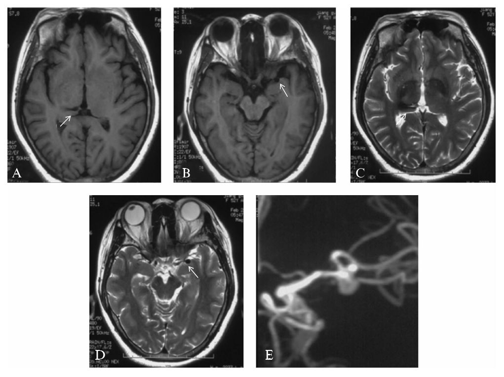 患者,55岁,女性,因“头痛3周”就诊,MRI检查可见右侧丘脑出血后陈旧性软化灶(图10-1A、C),左侧侧裂池内T1WI及T2WI可见局部血管流空影(图10-1B、D),进一步MRA检查证实左侧大脑中动脉动脉瘤(图10-1E)。