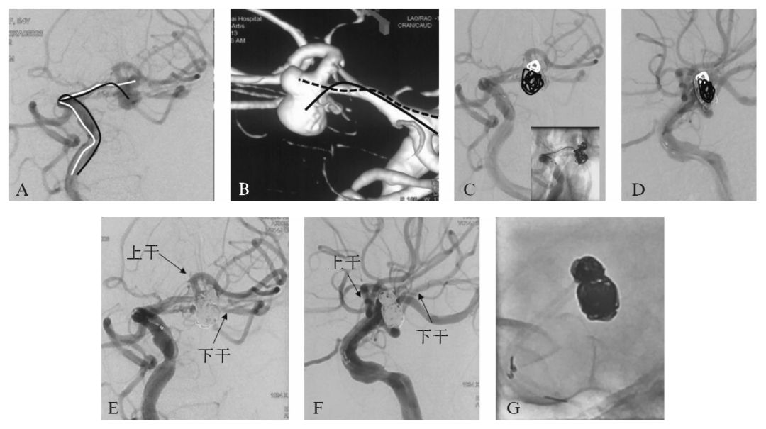 A~D:动脉瘤术中操作示意图,2根微导管通过塑形分别超选入动脉瘤的两个子囊内,通过反复调整微导管位置、张力控制弹簧圈的填塞部位;白色及黑色线所示为动脉瘤上下子囊微导管超选示意(A,B)及填塞效果示意(C,D),图B因对比度需要白色曲线改用虚线代替;E~G为术后造影图,显示动脉瘤栓塞后载瘤动脉及分支保持通畅