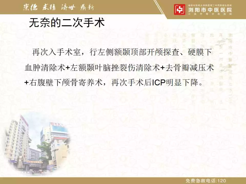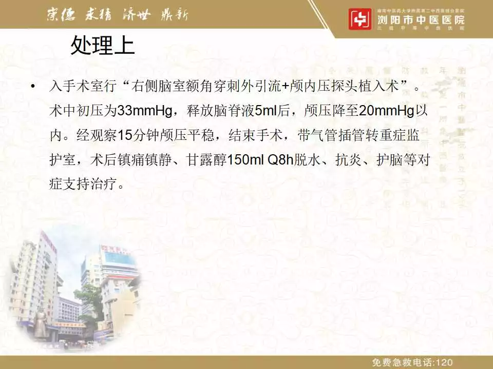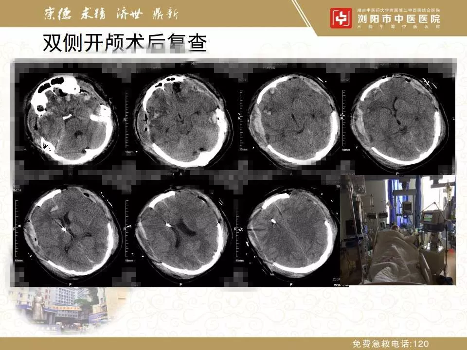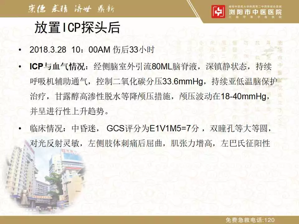 2. 该病例入院后行颅内压监测下的重症管理,颅内压波动在18-40mmHg,这一变化是持续升高还是间断波动需要引起注意,颅内压持续升高的趋势一定要给予高度重视。同时从病例资料描述中,亚低温治疗并未达到临床目标。头颅CT提示脑干变形明显,手术指证强,最佳目标应该是在脑疝发生前执行减压手术。
