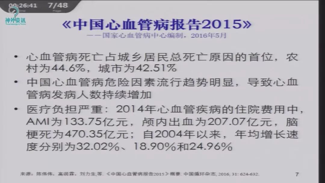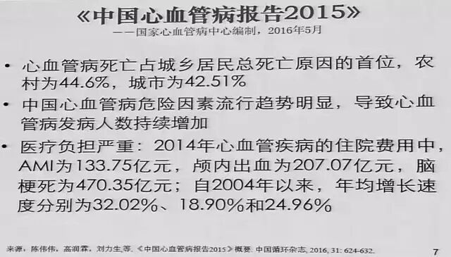 中国心血管病报告2015:心血管病死亡占城乡居民总死亡原因的首位,农村为44.6%,城市为42.51%。中国心血管病危险因素流行趋势明显,导致心血管病发病人数持续增加。心血管病的疾病负担日渐加重,已成为重大的公共卫生问题。脑血管病死亡率为151.91/10万(脑出血74.51/10万,脑梗死45.30/10万);城市脑血管病死亡率为125.78/10万(脑出血52.25/10万,脑梗死41.99/10万)。医疗负担严重,2014年颅内出血为207.07亿元,脑梗死为470.35亿元。自2004年以来,年均增长速度分别为6.63%和2.81%。
