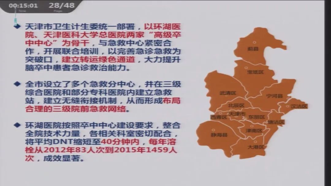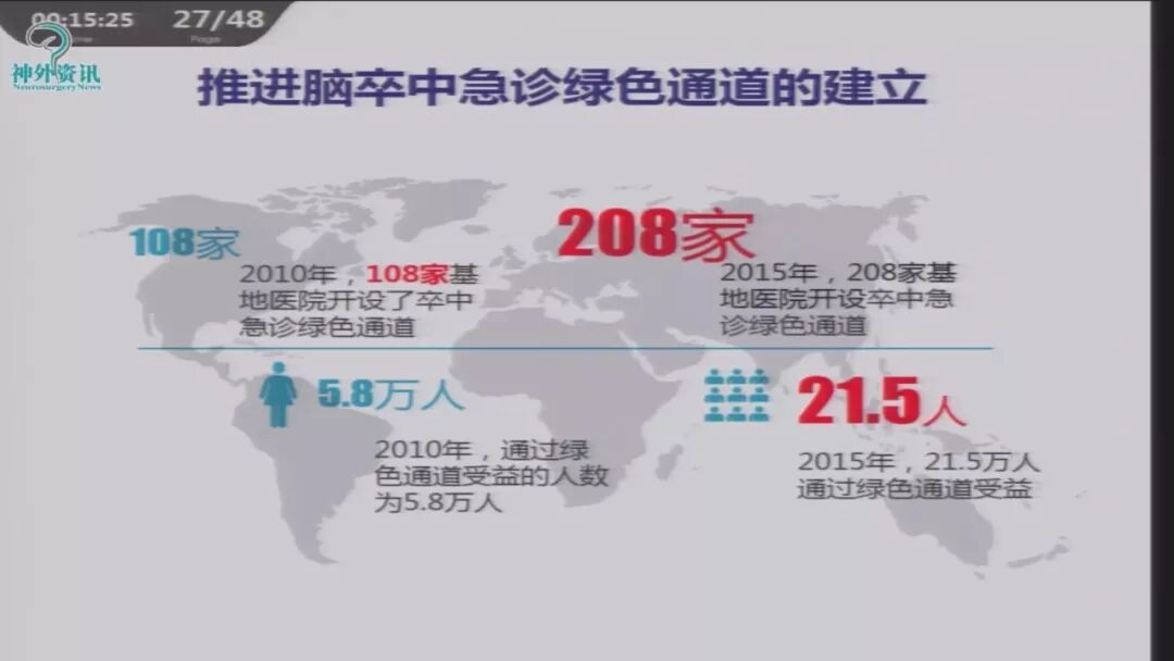 推进脑卒中急诊绿色通道的建立,2015年共有208家医院开设卒中急诊绿色通道,受益人群达21万。DNT时间大大缩短。