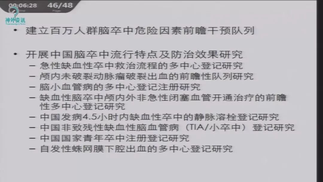 中国卒中流行特点及防治效果研究:急性缺血性卒中救治流程的多中心登记研究,颅内未破裂动脉瘤破裂出血的前瞻性队列研究,脑小血管病的多中心登记注册研究,缺血性卒中颅内外非急性闭塞血管开通治疗的前瞻性队列研究,中国发病4.5小时内缺血性卒中的静脉溶栓登记研究,中国非致残性缺血性脑血管病(TIA或小卒中)登记研究,中国国家青年卒中注册登记研究,自发性蛛网膜下腔出血的多中心登记研究。这是国家及大的临床中心要牵头办的事情,其成果将会惠及百姓。