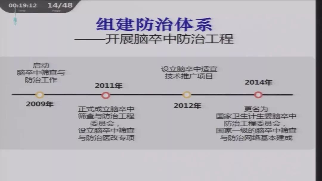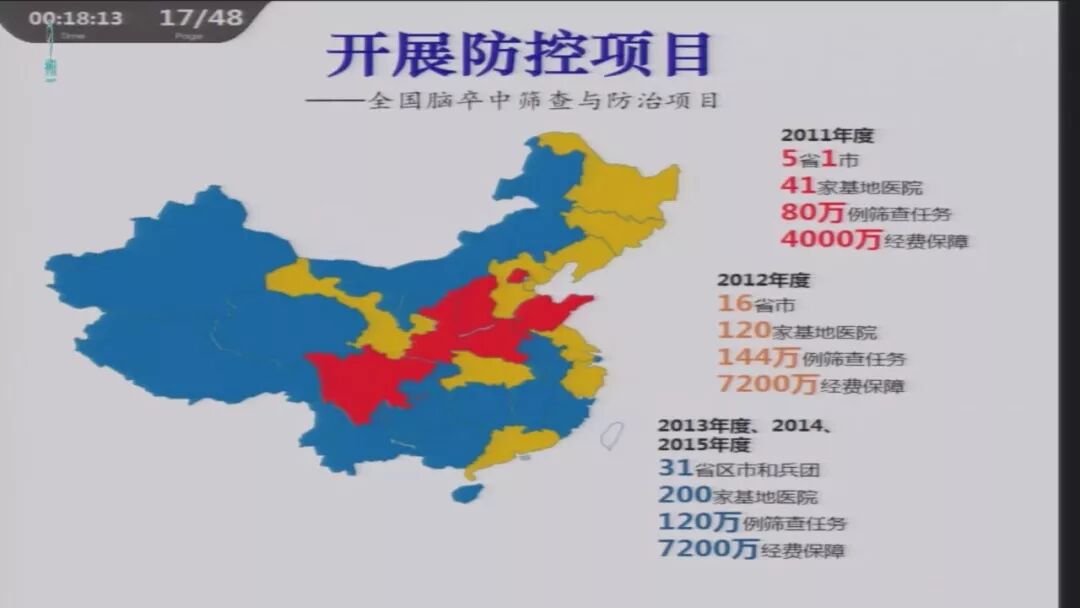 组建防治体系,推广适宜技术;开展防控项目(全国脑卒中筛查与防治项目),提高健康素养,覆盖全国分布合理的基地医院网络体系初步形成。