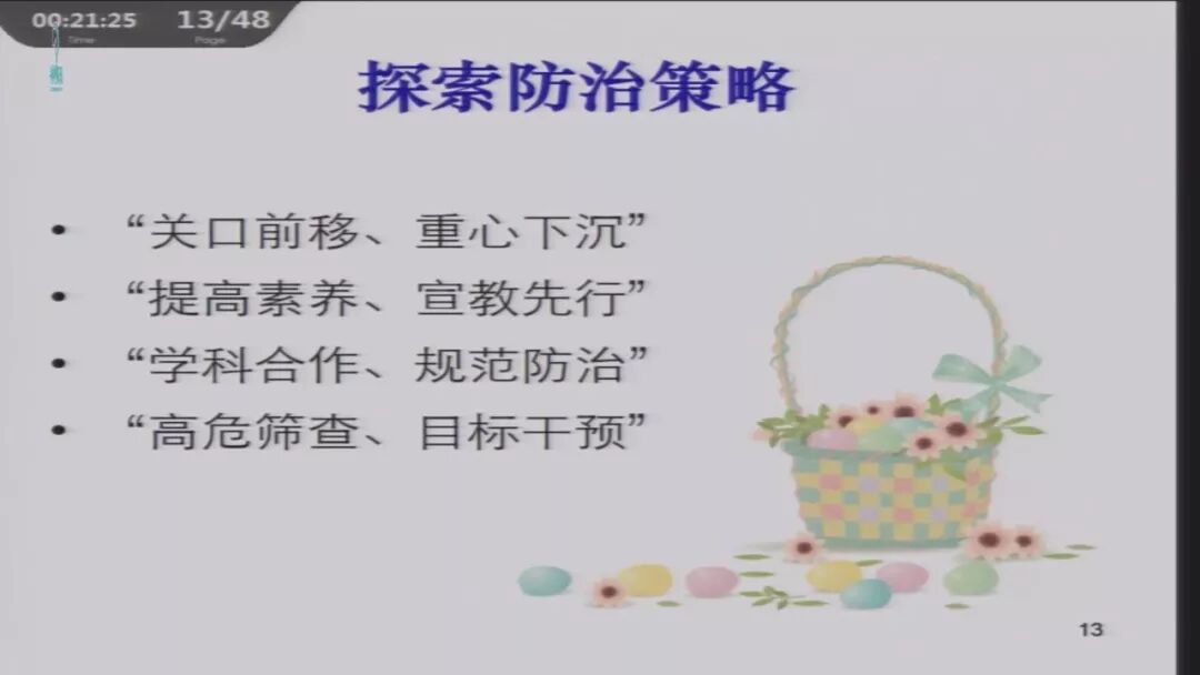 解决重点问题的尝试主要有: 防治策略:关口前移,重心下沉;提高素养,宣教先行;学科合作,规范防治;高危筛查,目标干预。