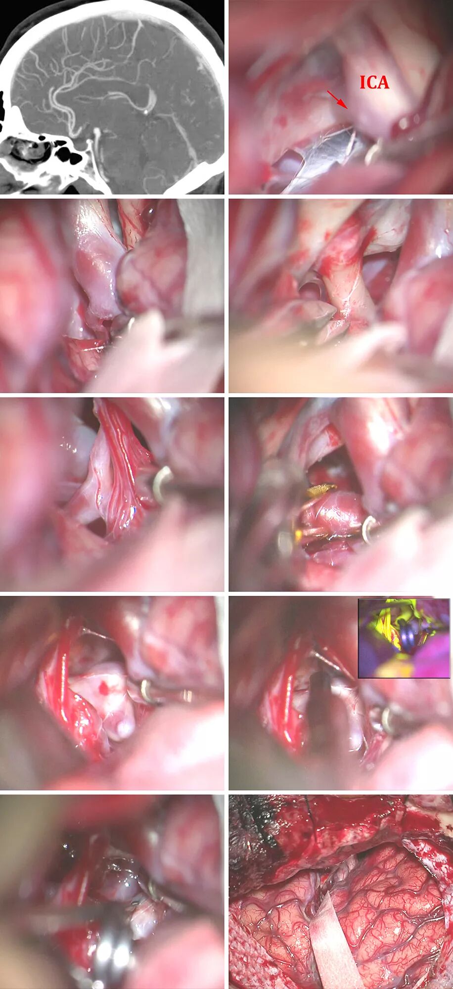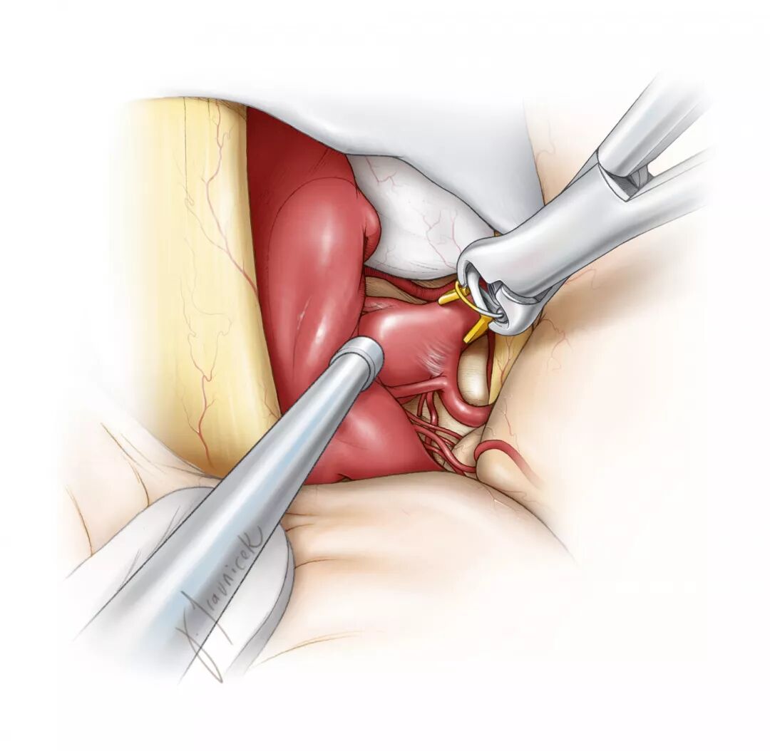 这二种通路都需手术者推移ICA使手术间隙最大化。如果有大的粥样斑块造成ICA推移受限,第三种选择是采用ICA分叉上的间隙(颈内动脉上三角)。该入路的主要缺点是对A1段与M1段的穿支操作受限。